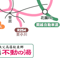 練馬I.C.より関越自動車道にて花園I.C.下車。国道140号寄居・秩父方面へ5分。皆野寄居バイパス経由で、不動の湯へ20分。